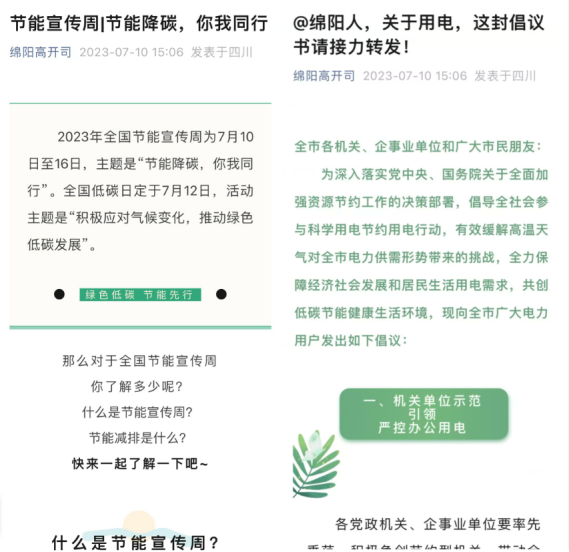 為深入貫徹落實(shí)生態(tài)文明建設(shè),做好節(jié)能環(huán)保工作,傳播節(jié)能理念,7月10日以來(lái),高開司積極開展“節(jié)能降碳,你我通行”節(jié)能宣傳活動(dòng)。充分運(yùn)用綿陽(yáng)繞城高速LED屏、公眾微信號(hào)、工作群等載體傳播低碳生活理念,大力倡導(dǎo)綠色低碳生產(chǎn)生活方式、接力綿陽(yáng)節(jié)電倡議,積極營(yíng)造節(jié)能降碳濃厚氛圍。