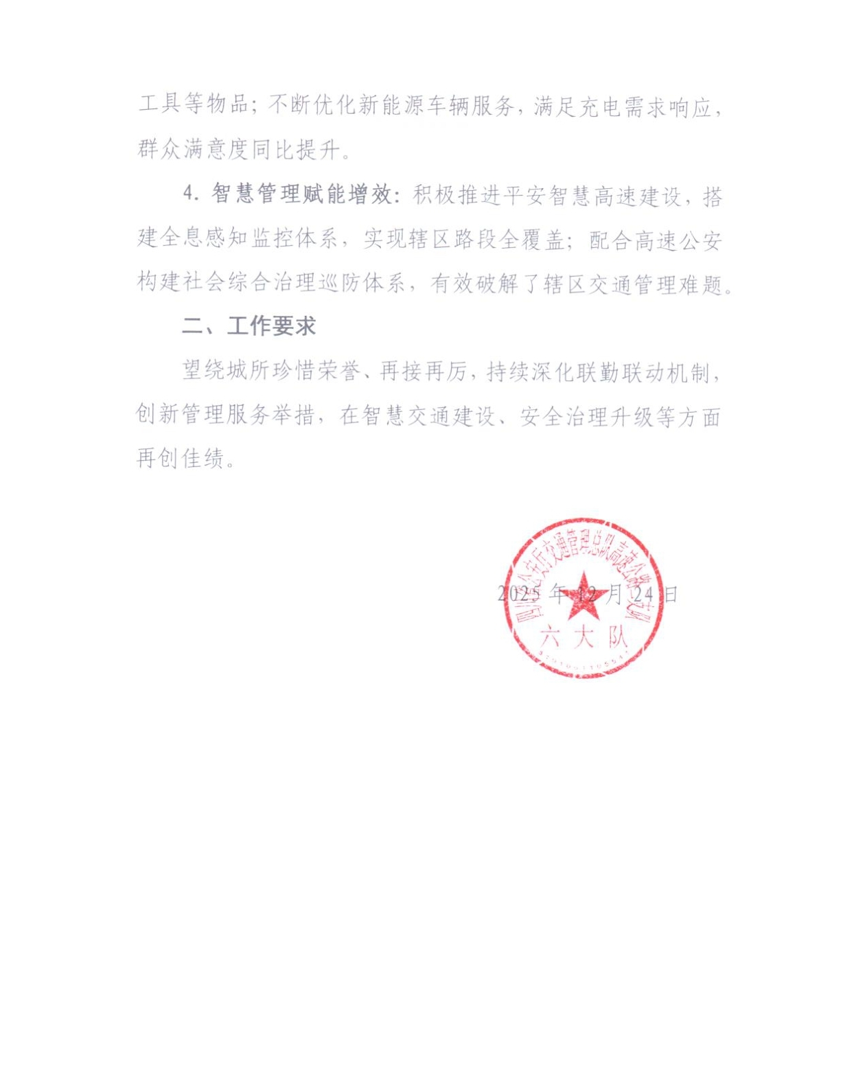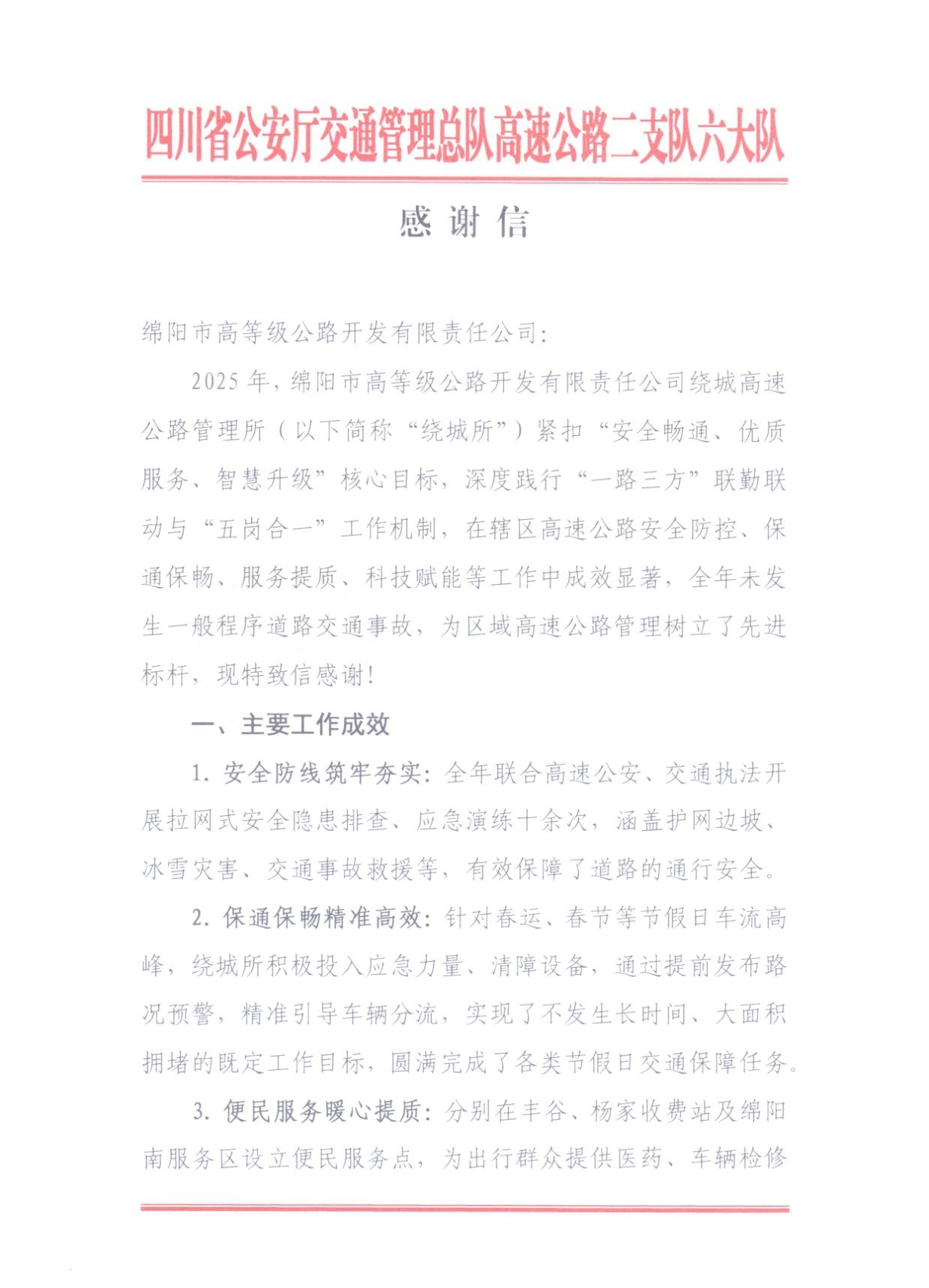 1月15日,高開司收到來自四川省公安廳交通管理總隊(duì)高速公路二支隊(duì)六大隊(duì)的一封感謝信。信中對(duì)高開司繞城高速2025年度“安全暢通、優(yōu)質(zhì)服務(wù)、智慧升級(jí)”核心目標(biāo),深度踐行“一路三方”聯(lián)勤聯(lián)動(dòng)與“五崗合一”工作機(jī)制,在轄區(qū)高速公路安全防控、保通保暢、服務(wù)提質(zhì)、科技賦能等工作中成效顯著,全年未發(fā)生一般程序道路交通事故,為區(qū)域高速公路管理樹立了先進(jìn)標(biāo)桿,給予高度贊譽(yù),對(duì)公司與高速公安攜手筑牢道路安全防線、全力保障公眾出行順暢的堅(jiān)實(shí)舉措表達(dá)誠(chéng)摯謝意,字里行間滿含認(rèn)可與期許。
